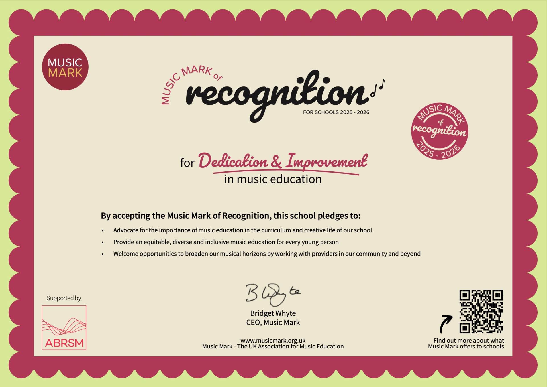 We are delighted to announce that Windmill has been awarded the Music Mark of Recognition for Dedication in 2025–26 in recognition of our commitment to high-quality music education and continuous improvement we offer our pupils.